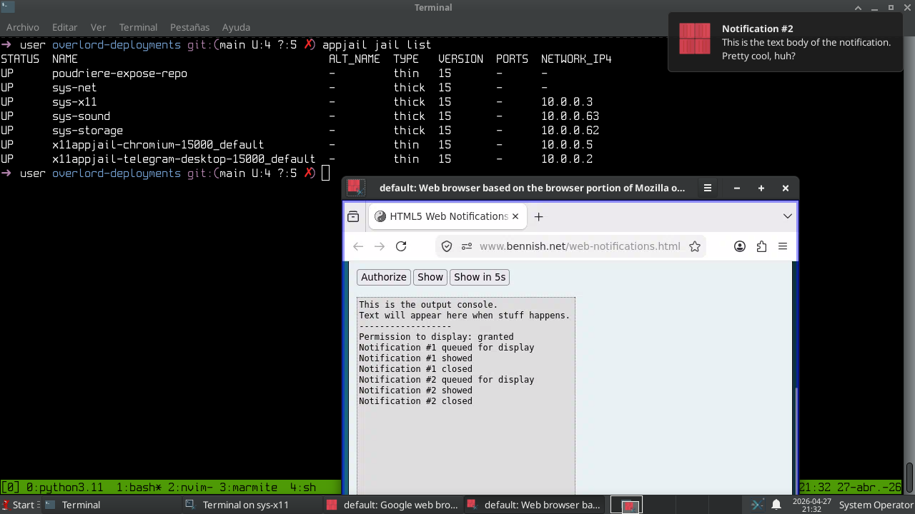 This is no different from running the notification service on the host, except that you need to start the service from xfce4-terminal (and, if you want, via tmux). As you can see, s6 is already installed, so follow the steps outlined in the x11appjail's README 10 and you’ll be able to receive notifications.