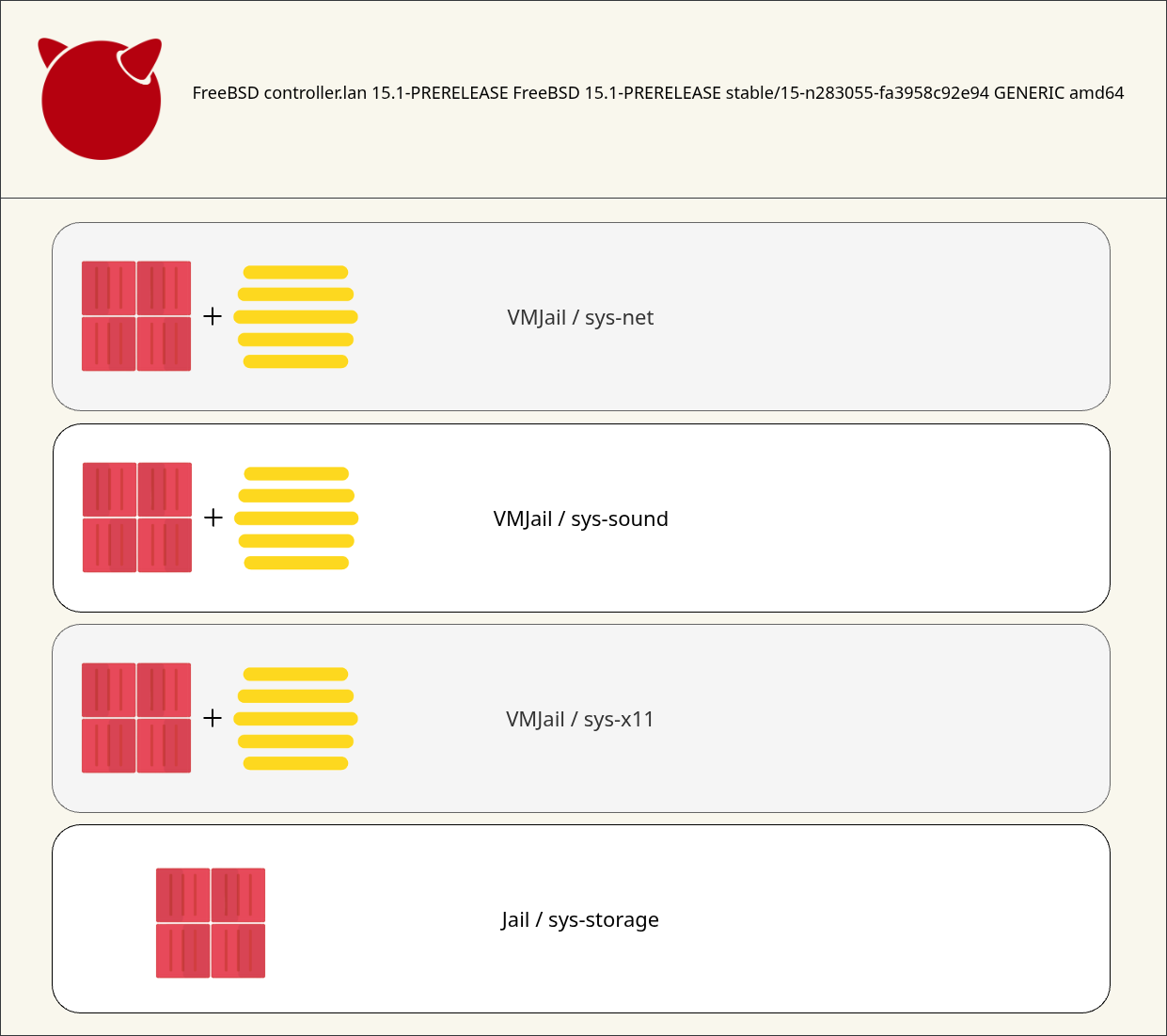 $ appjail-reproduce -fdb sys-jail sys-sound sys-vm sys-x11