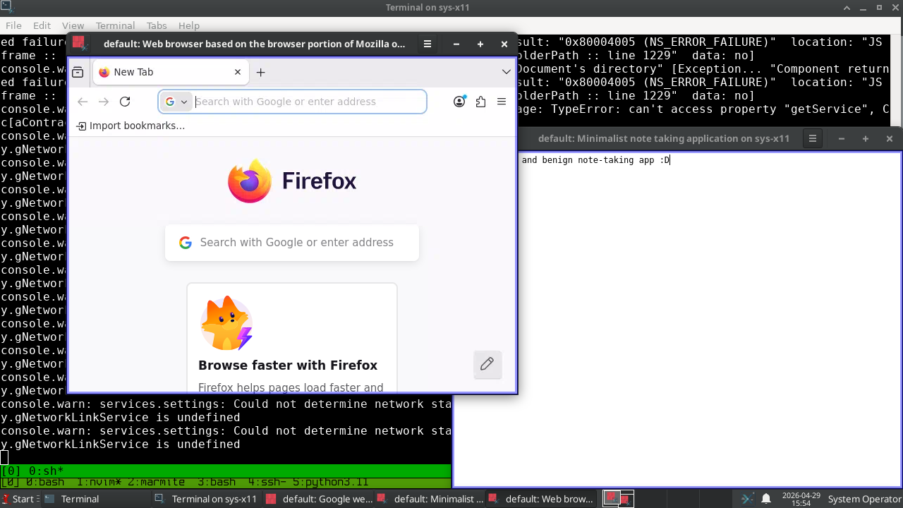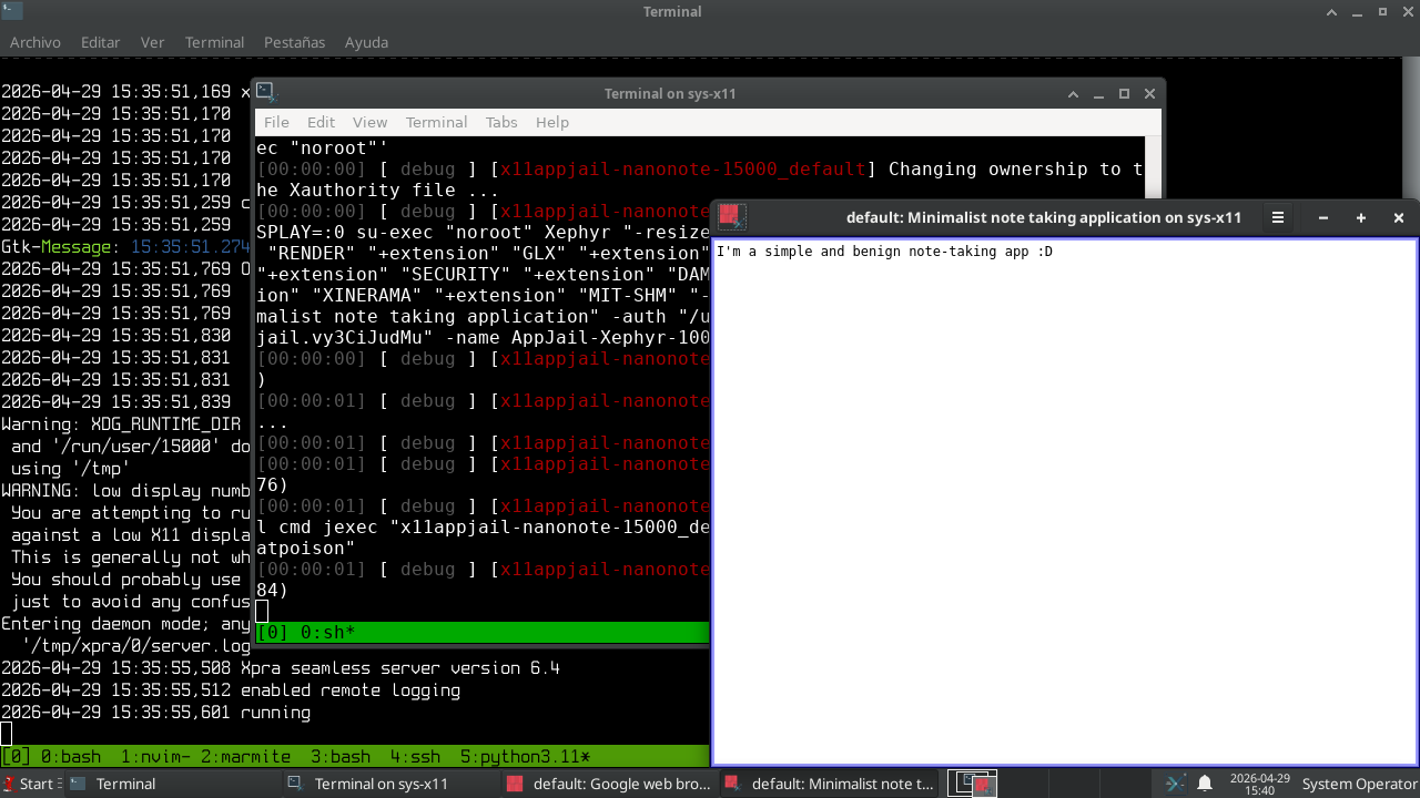 Now it's time to run Nanonote from Xpra. We'll use xfce4-terminal as the launcher and to manage the x11appjail services. You can run xpra start and then env DISPLAY=:0 ~/x11appjail/apps/x11appjail-nanonote-15000_default/START, from our ssh session, but the environment created by Xpra isn't inherited, which is necessary for notifications since they use D-Bus.